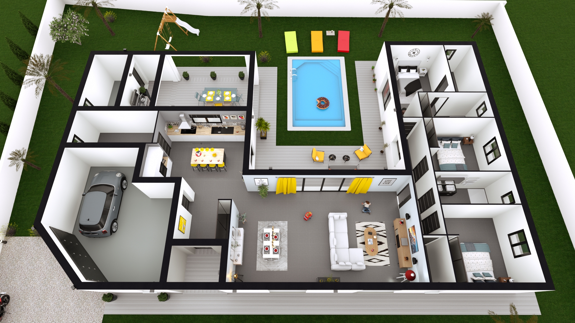 Ce plan met en évidence une conception moderne et fonctionnelle, qui favorise la vie en plein air et les espaces de vie ouverts, tout en garantissant l’intimité des espaces de nuit.