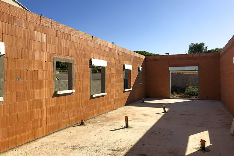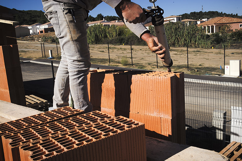 - Les murs extérieurs sont bâtis en briques à coller de type BGV3+ de chez BIO’BRIC.