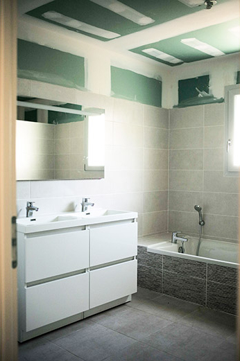 - Baignoire acrylique 170×75 ou bac à douche extra plat 90×90 (selon le modèle), ensemble meuble vasque complet avec miroir lumineux, WC double chasse 3/6l et évier en grès 2 bacs sur meuble blanc.